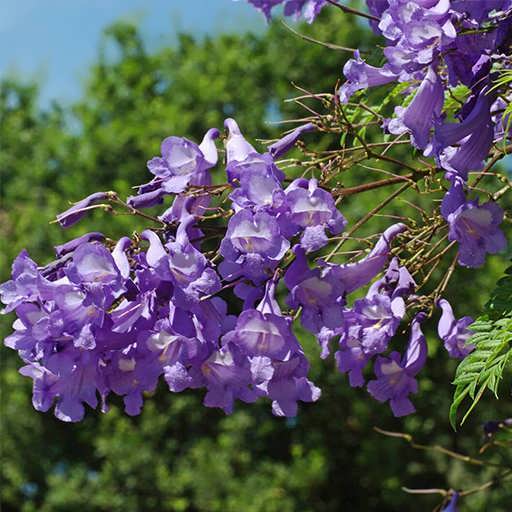 اواخر فصل بهار و اوایل تابستان بر روی شاخه های این درخت گلهای بنفش خوشه ای مانندی به حالت توده گسترده آویزان رشد می کند. شکل ظاهری گل های این درخت، به صورت هر گل با یک تاج آبی پنج لبه ای تا آبی بنفش بوجود می آید. هر گل تا 5 سانتی متر طول دارد و طول هر خوشه گل به 30 سانتی متر می رسد که زیبایی شگفت آور و تحسین برانگیزی به ظاهر درخت می بخشد. رشد و شکوفایی گل ها حدود دو ماه طول می کشد و گل های این درخت به مرور به غلاف های بذر چوبی به قطر حدود 5 سانتیمتر تبدیل می گردد که حاوی تعداد زیادی دانه مسلح و بالدار هستند. رنگ برگ های این درخت تقریبا در تمام طول سال سبز است و فقط در دوره کوتاهی در اردیبهشت و خرداد خزان دارد.