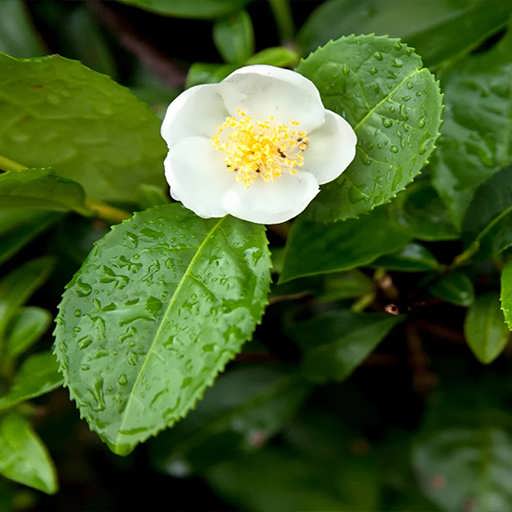 گل های گیاه چای معمولاً در فصل تابستان ظاهر می شوند و به شکل گل های سفید یا کرم با مرکز زرد رنگ هستند. این گل ها به صورت تکی یا در خوشه های کوچک رشد می کنند و عطر ملایمی دارند که جذب کننده حشرات مفید است.