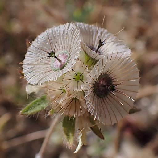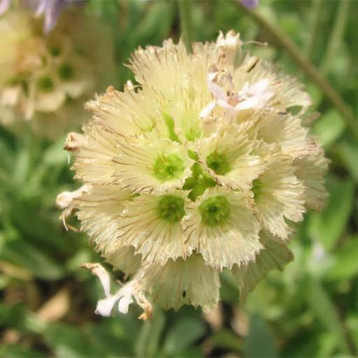 گل ها قطری در حدود 4 سانتیمتر دارند و به رنگ های آبی، بنفش، صورتی، ارغوانی و سفید دیده می شوند. گل ها به صورت سر بر روی گل آذین قرار می گیرند و هر سر شامل تعداد زیادی گلچه کوچک است. کاسه گل دارای پنج کاسبرگ به شکل ریش است که تقریباً به اندازه گلبرگ ها است و پس از ریزش گل ها، کاسه گل ها به همراه براکت ها یک توپ سیخ دار را تشکیل می دهند.