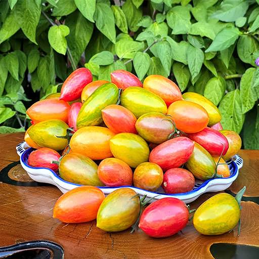 گوجه زیتونی ببری میکس (Mixed Tiger Plum Tomato) از جذاب ترین و رنگارنگ ترین ارقام گوجه فرنگی است که در سال های اخیر به دلیل ظاهر منحصربه فرد و طعم فوق العاده، توجه بسیاری از باغبانان و مصرف کنندگان را جلب کرده است. این گوجه مجموعه ای از واریته های زیتونی شکل و نسبتاً کشیده با رنگ های متنوع و رگه های متفاوت را شامل می شود که میوه ها در یک بوته یا بسته بندی، ترکیبی از رنگ های زرد، قرمز، نارنجی، سبز و حتی ارغوانی با خطوط یا خال های روشن و تیره را در بر می گیرند. این تنوع رنگ باعث شده که هم برای زینت سالاد و سفره و هم برای بازارهای نوآور و صادراتی، محبوبیت بالایی داشته باشد.