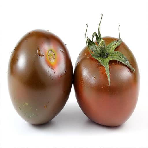 میوه ها به طور متوسط گرد تا بیضی هستند، اندازه ای بین ۶۰ تا ۱۲۰ گرم دارند و رنگ آن ها پس از رسیدن حنایی تیره تا قهوه ای مایل به قرمز است که گاهی رگه هایی از سبز تیره یا سیاه نیز در سطح میوه مشاهده می شود. پوست میوه نسبتاً ضخیم و براق است، گوشت آن متراکم و آبدار با طعم شیرین-ملایم و منحصر به فرد بوده و دانه ها در مقایسه با گوجه فرنگی های قرمز معمولی کمی کمتر است.